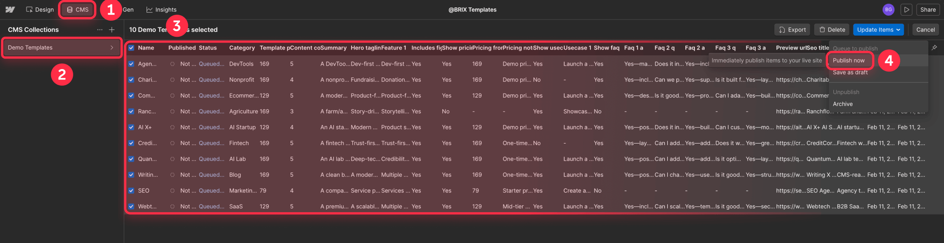 The key is designing enough CMS fields to render multiple unique sections per page. Start by defining your spreadsheet with fields for name, slug, summary, primary content, FAQs, and SEO metadata. Then create a matching Webflow Collection where each column maps to the right field type. If an item can't meet a minimum content bar, it shouldn't be published yet.