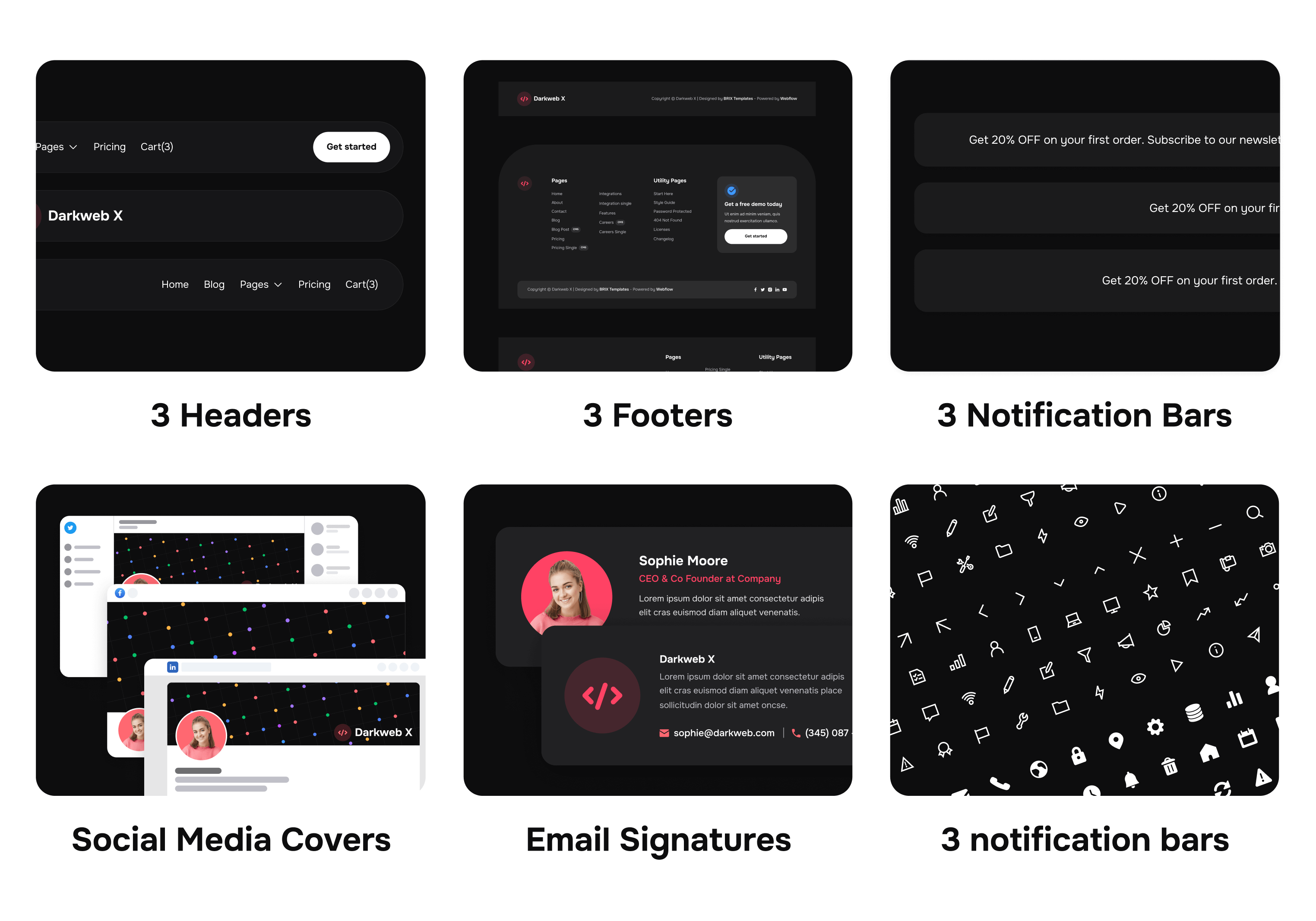 Also than the Figma file, Darkweb X Webflow Template comes with many other great benefits and perks that not all Webflow Templates come with, and those are: 3 unique headers, 3 unique footers, 3 notification bars, social media cover designs that match with the template, 2 email signatures, and an icon family set loaded into the template.